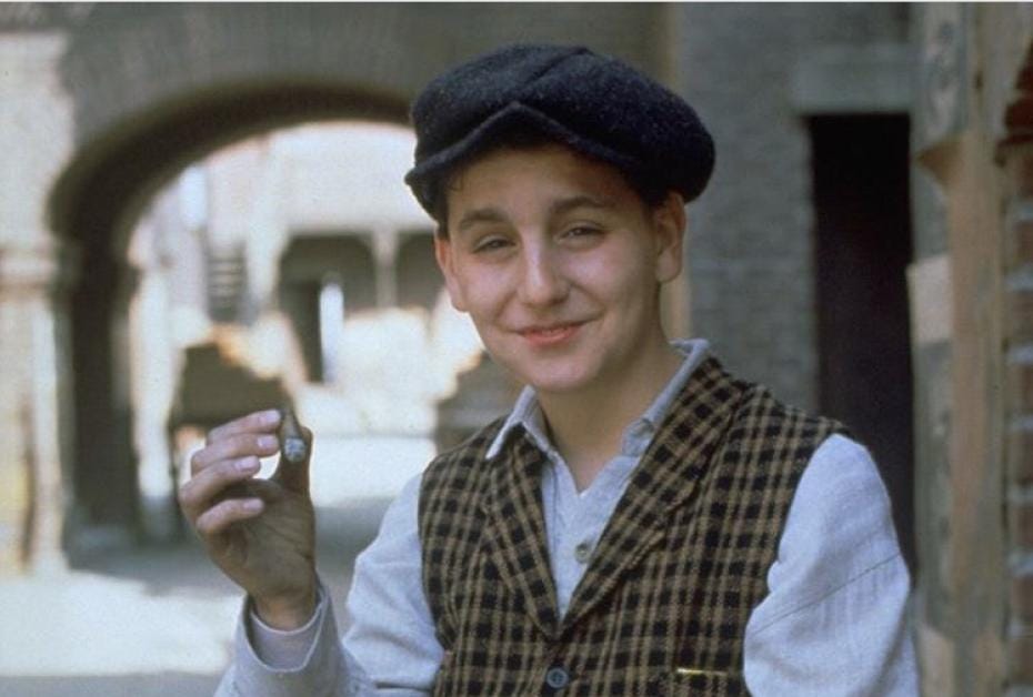 Max Casella: Racetrack! Yeah, Newsies was my first movie—my first theatrical movie—and I was really excited about it. It was a historical piece, set in 1899, so I threw myself into that like a madman and lived at the L.A. Public Library, researching the role and everything, studying Jacob Riis photographs. I loved doing it. It was a huge, long adventure—six months!—and I just loved Racetrack. I just jumped right into. Racetrack and all of those guys, they were like little men. They dressed like men, so they pieced together their outfits. Like, Racetrack was a bit of a dandy, so he had a pocket watch, a vest, and spats, or whatever it was. I always felt like the Artful Dodger in that way. [Laughs.] But, yeah, I really threw myself into it completely.